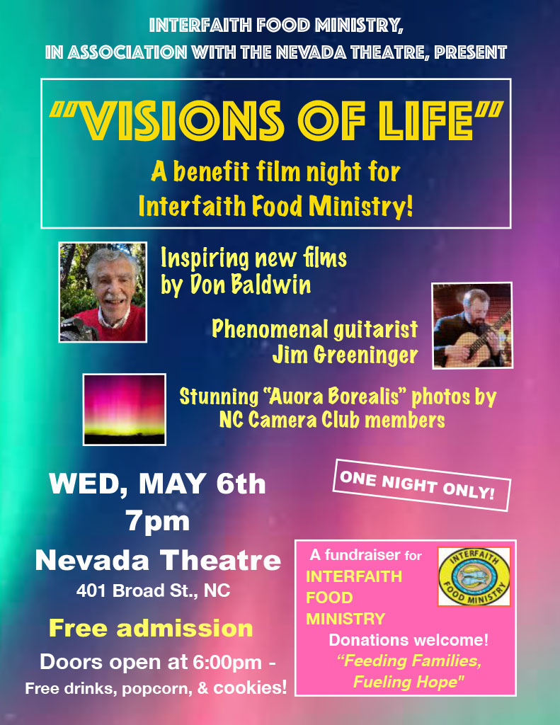 support our local Interfaith Food Ministry. Entitled, “Visions of Life,” the evening will feature several new inspirational films by photographer Don Baldwin. In addition to the films, the event will include a special appearance by local guitarist Jim Greeninger, and also feature stunning images of the night sky and Aurora Borealis by members of the Nevada County Camera